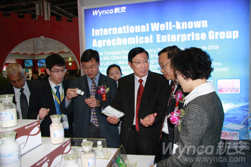 開幕式結(jié)束后,中國石油和化學(xué)工業(yè)聯(lián)合會趙俊貴副會長、中國貿(mào)促會化工行業(yè)分會馬春艷副秘書長、中國農(nóng)業(yè)部農(nóng)藥檢定所葉貴標(biāo)處長等領(lǐng)導(dǎo),在總經(jīng)理的陪同下,重點參觀了公司的特裝展位(如圖)。趙俊貴等領(lǐng)導(dǎo)在認(rèn)真聽取了集團(tuán)公司的經(jīng)營情況、技術(shù)開發(fā)、市場推廣和未來規(guī)劃后,對近幾年來取得的輝煌成就給予了高度贊譽(yù)。
