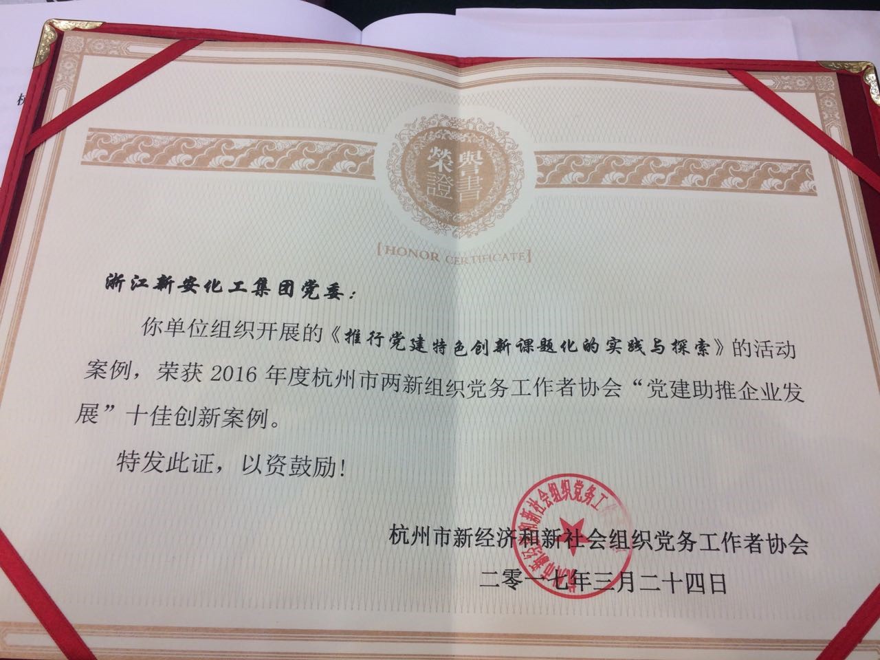 會(huì)議隆重表彰了2016年度各類先進(jìn)。集團(tuán)黨委書記潘秋友榮獲杭州市“兩新”協(xié)會(huì)優(yōu)秀會(huì)員,集團(tuán)黨委負(fù)責(zé)的杭州地區(qū)“兩市兩縣”第八片組榮獲優(yōu)秀集體,集團(tuán)黨委申報(bào)的“推進(jìn)黨建特色創(chuàng)新課題化的實(shí)踐和探索”榮獲“十佳創(chuàng)新案例”,并獲得優(yōu)秀通訊員等榮譽(yù)。
